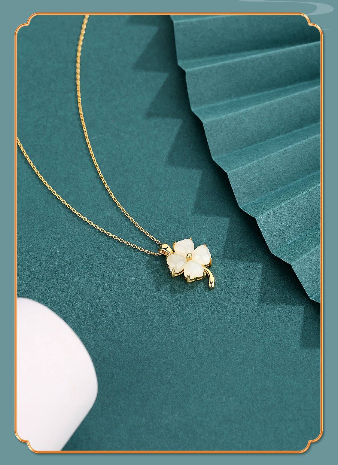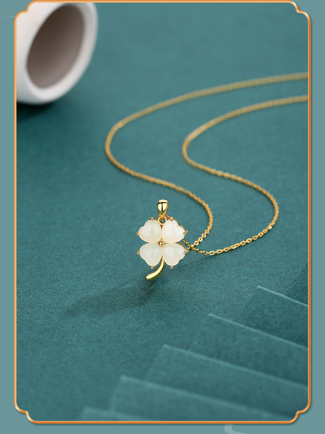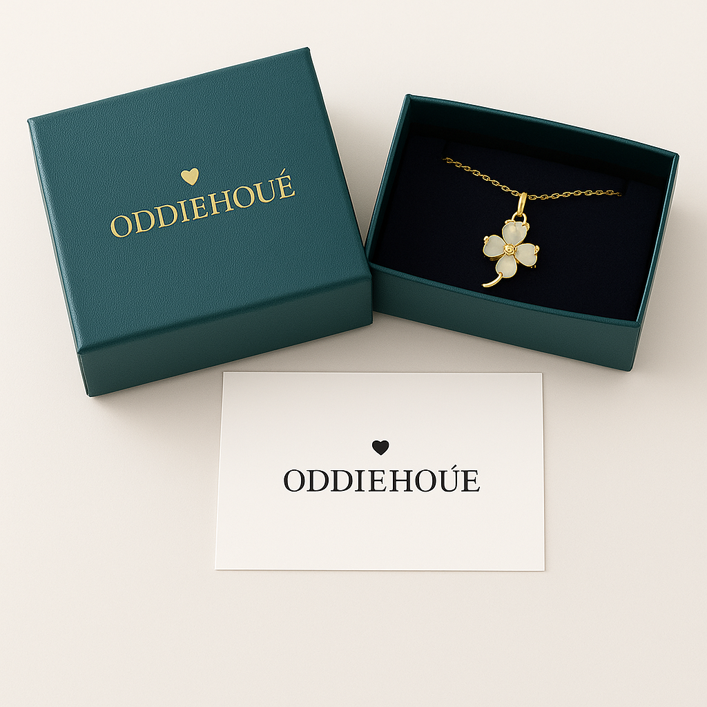 • El amuleto central en forma de trébol, tallado en pétalos de corazón, refleja la luz como un pequeño símbolo de bendiciones, haciendo que cada detalle brille con intención propia.
